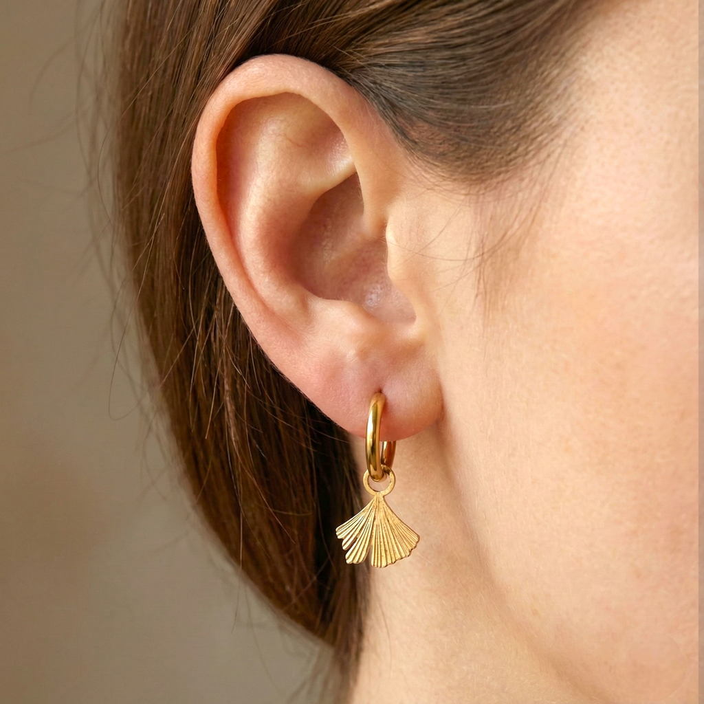 Bedeloorbellen met een Ginkgo blad. Dit blad is afkomstig van de Japanse notenboom, ook wel bekend als Tempelboom. Zowel de oorring als de bedel zijn gemaakt van goudkleurig staal, wat duurzaam is en door de afwezigheid van nikkel, antiallergisch is. Bovendien kan je douchen en zwemmen met alle oorbellen van Versierd